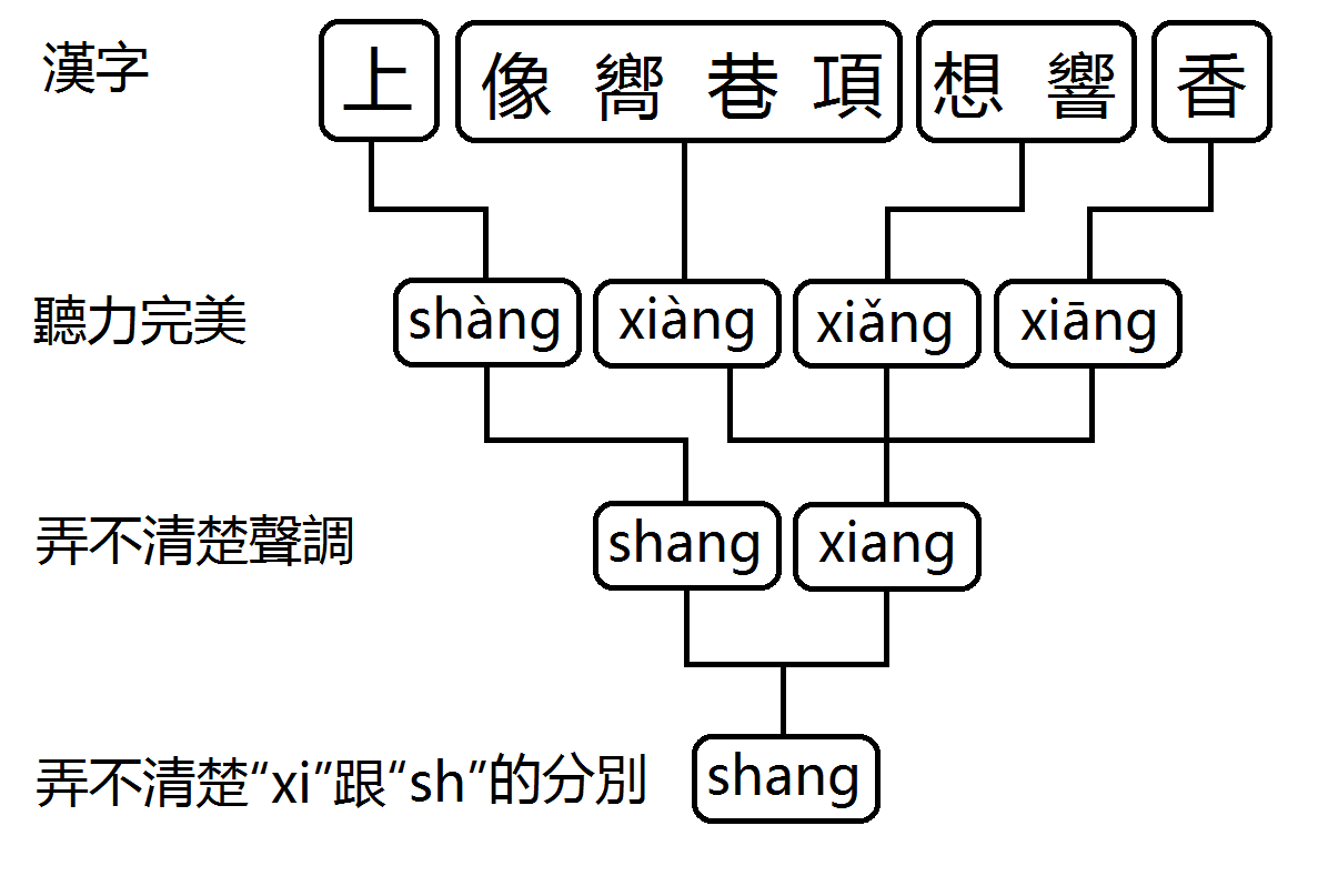 這情況之下,每個數字的差別還是都聽得出來,仍然沒有什麽問題 。可是,最後假如我們有兩種問題:聽者仍然弄不清聲調的分別,而且説者的口音不標準,是臺灣口音,就是會把「shi」説成「si」的。