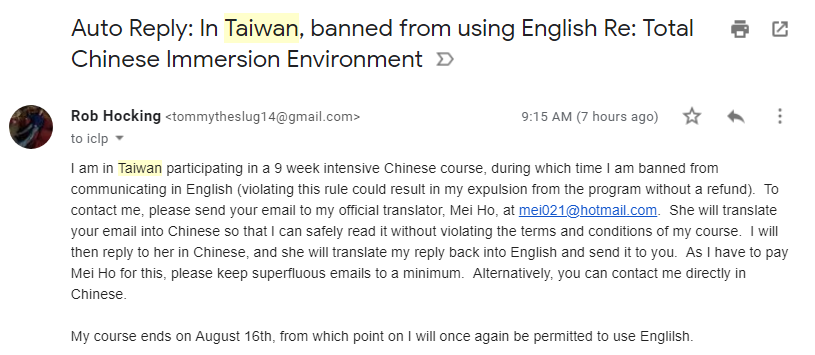 My Chinese program in Taiwan has a language pledge that will go into effect tonight at midnight and continue until August 16th, during which time I am not permitted to use any language other than Chinese for communication.